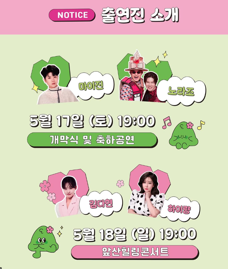 - 개막식 & 축하공연: 마이진, 노라조 (5/17), 김다현, 하이량 (5/18)
