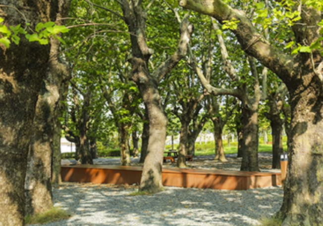 과거 캠프하야리아 부대의 플라타너스 숲과 나무 전봇대를 재활용한 태양광 조명 기둥은 역사와 기억을 되새기는 상징적 공간입니다.