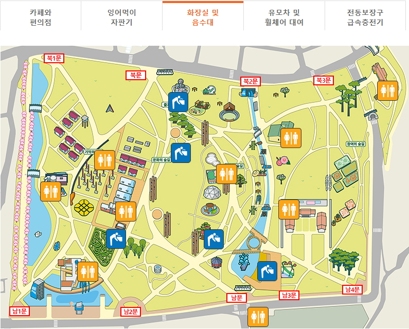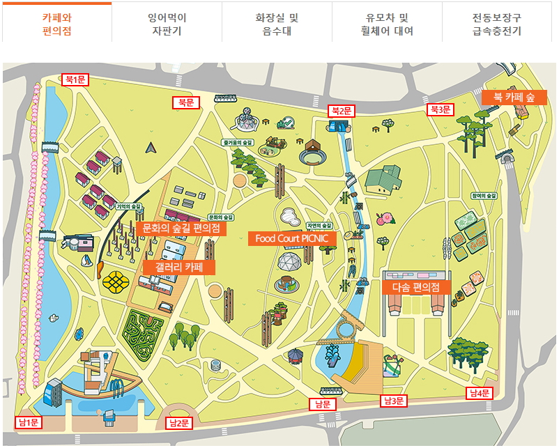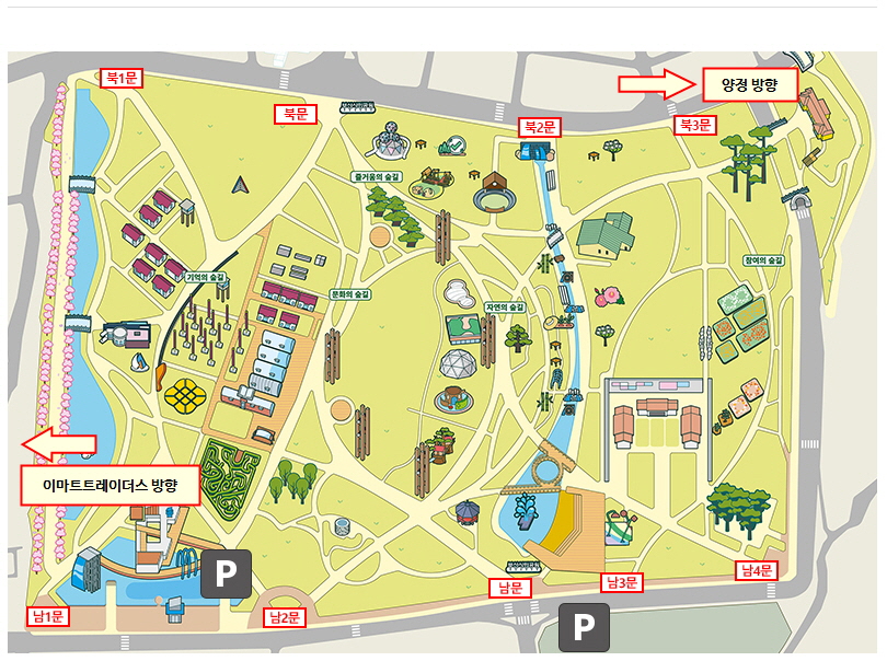 기억(은행나무), 문화(느티나무), 즐거움(튤립·왕벚나무), 자연(소나무), 참여(후박나무) 테마의 숲길과 약 300m의 메타세콰이어 길은 공원의 대표 포토존입니다.