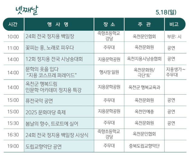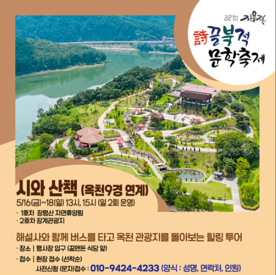 이번 옥천 지용제에 참여해 시와 예술, 자연이 어우러진 시간 속에서 힐링을 경험해보세요. 5월, 옥천에서 여러분을 기다립니다!