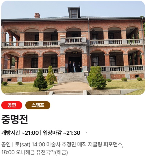 덕수궁과 정동길 일대를 중심으로 고궁 개방, 공연, 전시, 체험 등 다채로운 프로그램이 2일간 진행되는데요. 아래에서 정동야행 일정을 한눈에 확인해보세요!